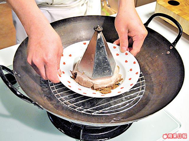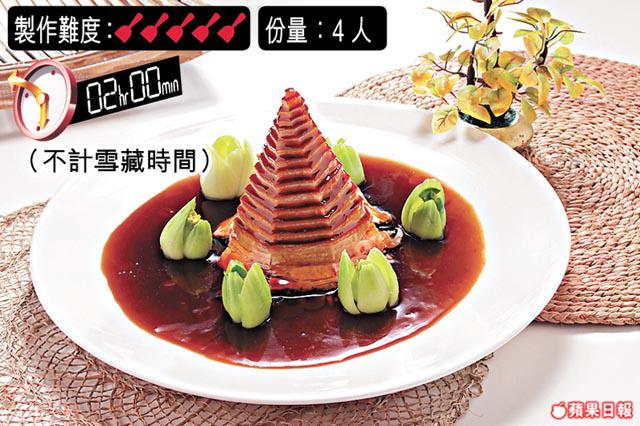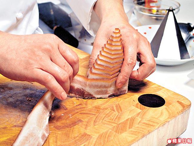 8. 東坡肉上放塔形模,依形將東坡肉切成六角形,然後用片刀法,將東坡肉由外邊開始連續片成薄片,再捲成塔狀,放入塔模中。