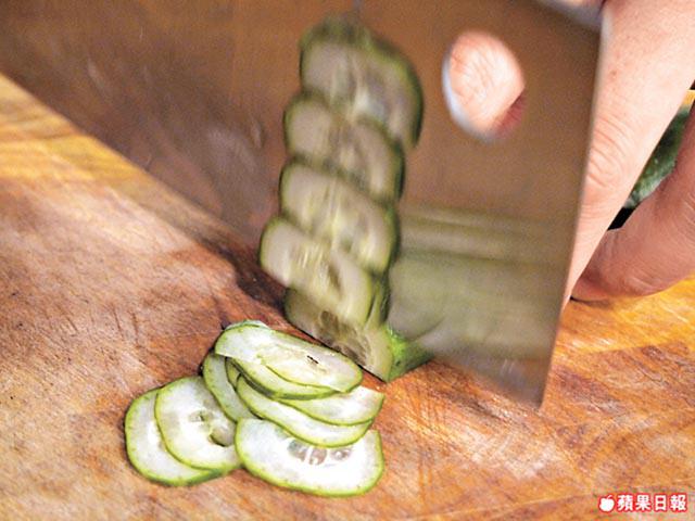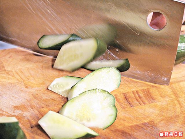 刀身與砧板成90°直角,由上而下將食材切斷,適合硬度平均的食材如青瓜。