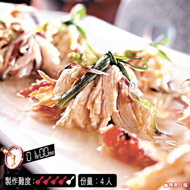 揚州豆腐乾2塊、金華火腿20克、雞絲(上湯煨熟)/鮮拆蟹粉各50克、鮮冬菇4隻、韭菜花8條、薑(去皮切絲)10克、雞湯400毫升