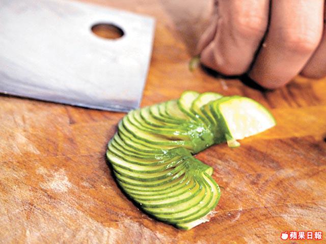 刀身與砧板成180°,將食材橫片切開,另一隻手要用力壓着食材,才能切得順滑。