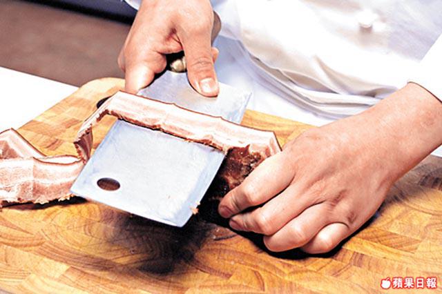 東坡肉以片刀法加推拉法(即來回鋸切),從頭到尾片成一片,充份體現刀工,同時又改變了傳統東坡肉的製法及造型,給人一種嶄新的視覺及口味享受。
