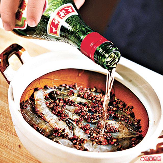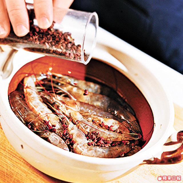 2.在蝦上再鋪一層花椒,倒入玫瑰露酒至蓋過花椒和蝦,醃10分鐘。