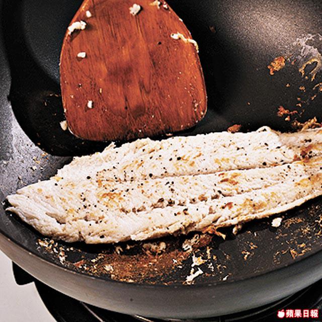 1.龍脷魚肉抹乾水份,以黑胡椒醃10分鐘備用。
