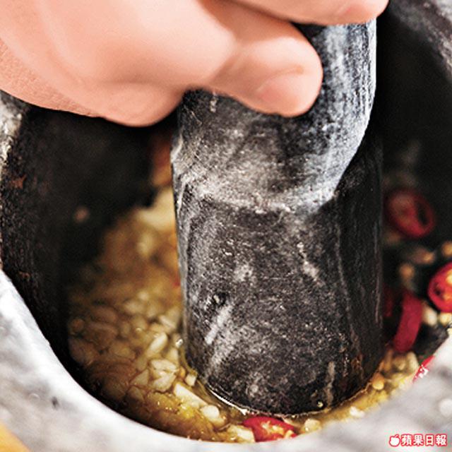 3.檸檬皮、檸檬汁、蒜頭、辣椒仔及芫荽放入石舂內舂碎成醃料。