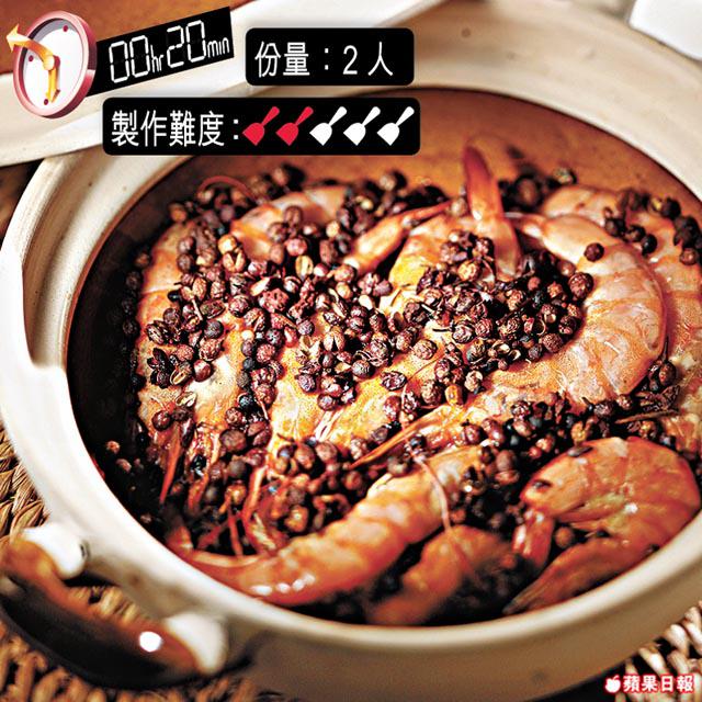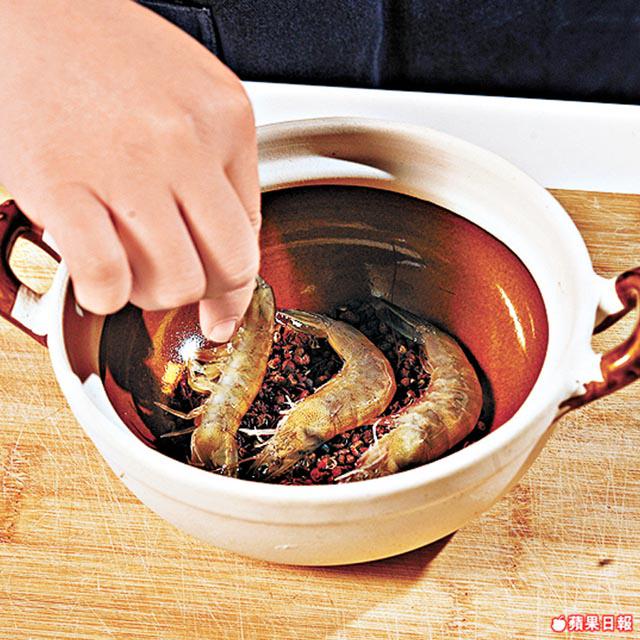 1.蝦洗淨抹乾水。小砂鍋底先放一層花椒,放上蝦。