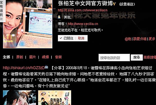 另外,在名為「謝霆鋒微報」的微博中,指霆鋒曾說:「我的命忌金,每個相士都說栢芝屬重金,一起的話輕則惹官非,重則其中一人會死,第一次和她拍拖,撞了車,坐了牢,她覺得是她剋住了我,但我一生無悔!我願意為愛去賭!以生命去換取一段真感情,我把這條命給你,要拿就拿。」霆鋒愛無悔的表現,又難怪令栢芝冧爆,對霆鋒死心塌地。