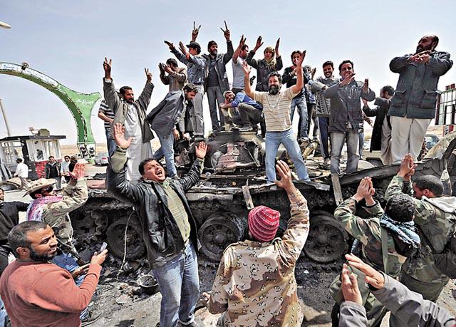 利比亞戰事進入新階段,在12國聯軍連續空襲九天後,反對派革命軍昨日(周日)再下一城,拿下石油重鎮拉斯拉努夫(RasLanouf),現正全力向西面挺進,直指狂人卡達菲(MuammarGaddafi)的家鄉蘇爾特(Sirte)。現在東部所有石油重鎮,都落入反對派手上。