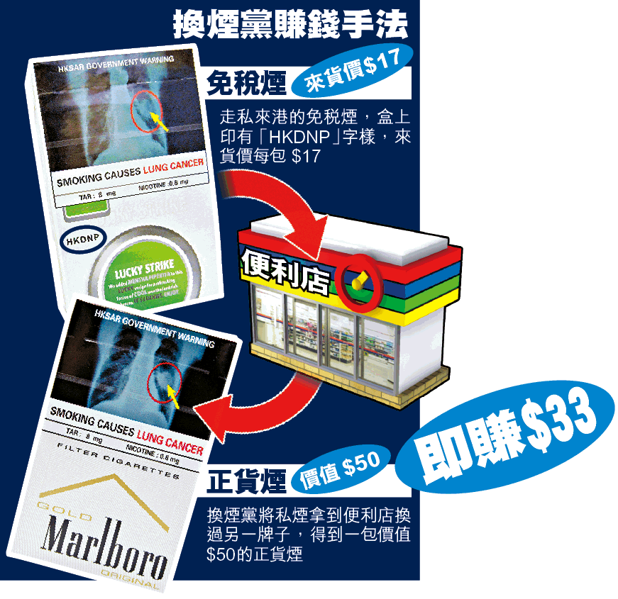 【本報訊】財政預算案勁加煙稅四成,過關免稅煙去年8月又實施「19支」限額,令大批不欲捱貴煙的煙民轉投私煙市場。據私煙販子透露,由於私煙與正貨煙價格差距進一步拉闊,近期吸引一批私煙黨聘請「車手」,專到各區便利店及報攤出蠱惑,以來貨價17元一包的走私免稅煙偷龍轉鳳,換成價值50元的已完稅正貨煙,賬面即賺33元。但他們會以「優惠價」40元轉手,每包淨賺23元,據知已有不少便利店被攻陷。