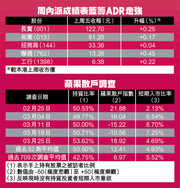 港股上周強勁反彈,散戶對後市的信心明顯提高,看好後市的散戶指標上周扭負為正,報18.92,較前周的-10.56大幅改善;但有意入市者比例由前周的7.25%,跌至4.69%;有貨在手的散戶比例則由前周的50.71%,微升至53.62%。