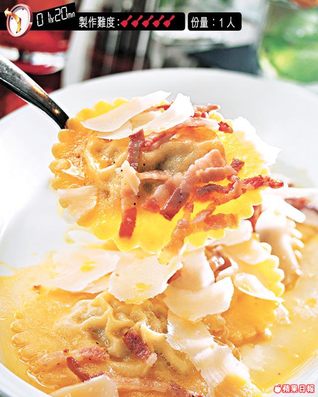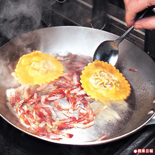 6.大火燒熱鑊,下煙肉粒炒香後,加入(5)炒勻,熄火,下餘下雞蛋,拌勻上碟,最後撒上巴馬臣芝士碎即可。
