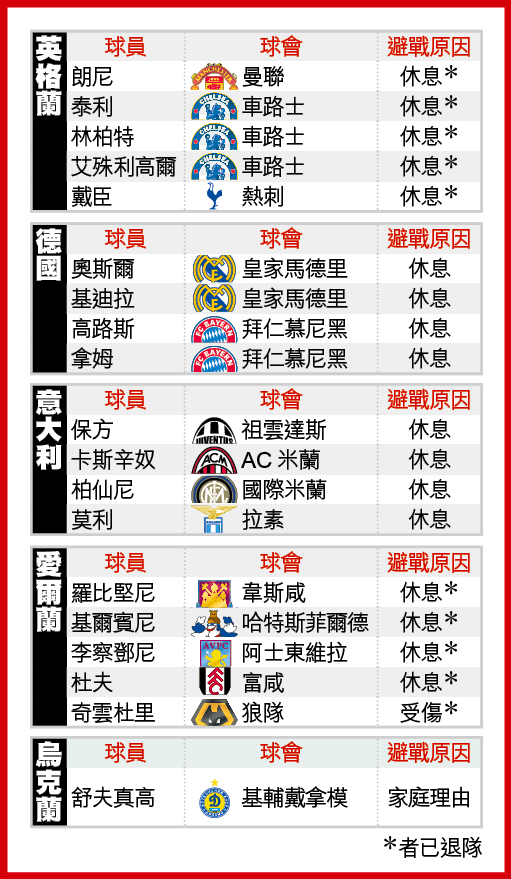 本周末歐洲各大聯賽不乏重量級戲碼,而各頂級球隊的戰將又心繫歐聯,各支國家隊的主帥也相當識做,表明在這輪以友賽為主的周中國際賽變陣。