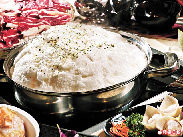 有得吃,有得玩!蛋白三文魚湯底用料夠新奇,拱起的一層蛋白賣相似疏乎厘。知你肚餓,但也別心急下配料,請先用刀十字,剖開蛋白層,再喝一啖魚湯,待甜到漏湯水滑入喉嚨,再下箸灼肥牛不遲。