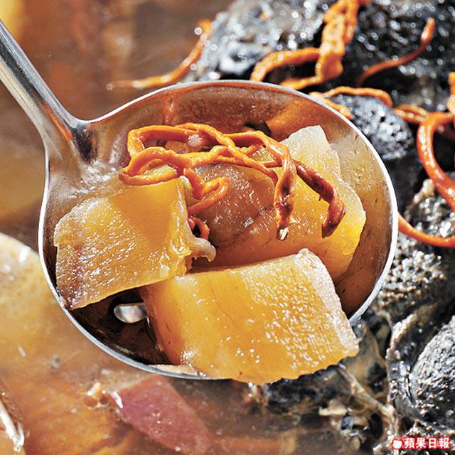 非常武俠小說Feel,「鼎煌」首創天山雪蓮蟲草花燉烏雞湯底,陣陣藥材味衝入鼻端,清甜滋潤,老闆Edmund:「研發湯底前請教過中醫,天山雪蓮果、乾蟲草花及烏雞同樣滋陰,烏雞更有止痛、滋補肝腎、益氣補血功效,能調節人體免疫力和抗衰老。」做足功課,湯底亦見真材實料,燉足六小時,每天最多只賣五至六個。春天潮濕,身體易濕熱水腫,Edmund:「帶子冬瓜盅湯底消暑開胃,冬瓜盅盛滿帶子及蝦仁等海鮮,冬瓜肉夠清甜,慢火烹製,比一般冬瓜盅多一份清鮮海鮮味。」湯底如此落足心機,難怪連梁朝偉、劉嘉玲也是座上客。