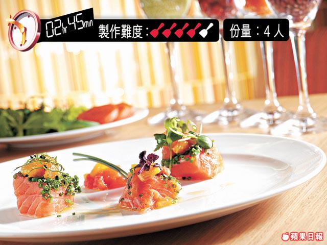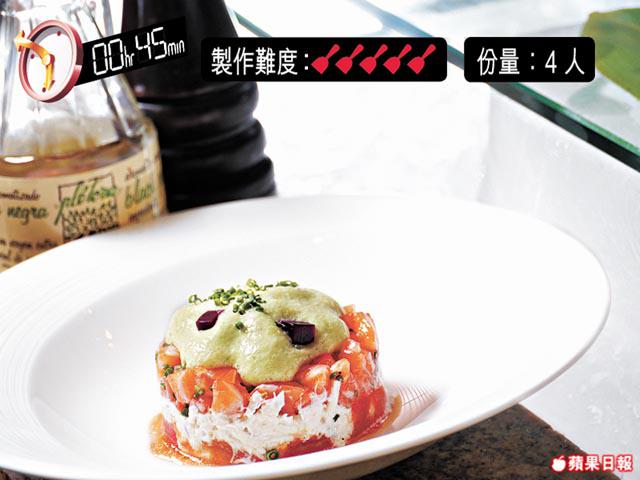 三文魚腩(切細粒)100克、熟蟹肉/番茄茸各30克、細葱50克、檸檬(刨皮)1個、初榨橄欖油10毫升、紅酒醋/黑胡椒碎/海鹽各少許
