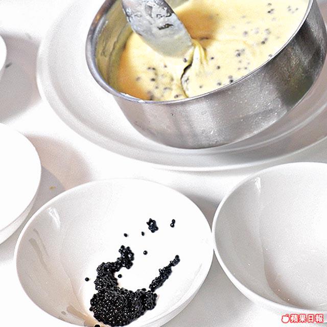 馬鈴薯汁:馬鈴薯(去皮切片)1個、鮮忌廉50毫升、黑魚子10克、牛油/海鹽/黑胡椒碎各少許