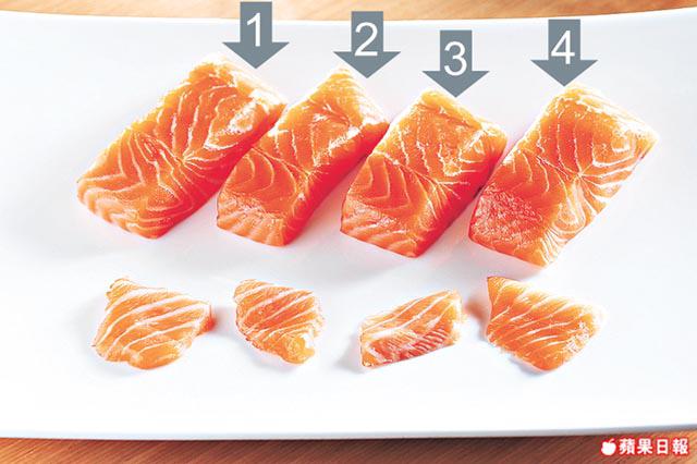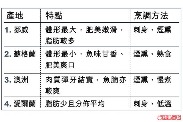 原來不同水域的三文魚亦有分別,「以腩部來說,挪威和蘇格蘭的較肥美,前者油感重,後者肥美得來爽口。」而挪威三文魚產量最高,價格較便宜;蘇格蘭是較貴價的品種;澳洲的飼養水域較廣,活動較多;愛爾蘭的則以有機飼料飼養,這三地的品種價錢較貴,香港餐廳較少購入。