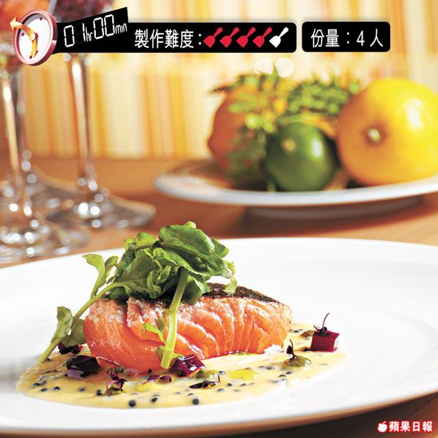 5. 碟上放上焗好的三文魚,放上香橙番茄沙沙,加上裝飾即可。