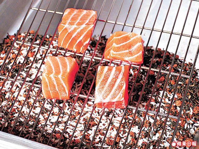 3. 煲內放一鐵架,放上三文魚,蓋上蓋焗8分鐘至三文魚呈淺啡色,備用。