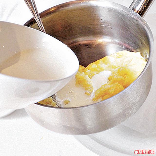 3. 馬鈴薯烚熟後瀝水壓成茸,混合鮮忌廉、牛油、海鹽、黑胡椒碎拌勻,以小火煮至稠身熄火,加入黑魚子拌勻。