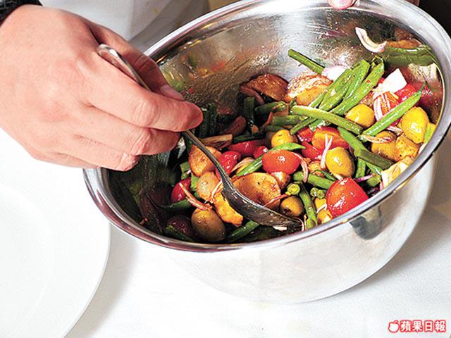 尼哥斯沙律:紅洋葱30克、迷你馬鈴薯/四季豆各100克、車厘茄50克、黑橄欖10克、初榨橄欖油15毫升、葡萄醋10毫升、海鹽少許