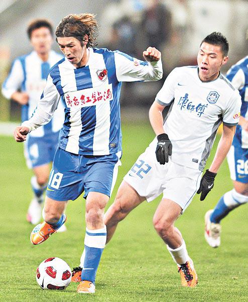 今屆中超周五展開,但賽前出現沒贊助商出資冠名贊助的情況,而中央電視台亦因此拒絕購下賽事轉播權。圖為周五4場之一的深圳紅鑽(左)與天津康師傅對壘,天津最後勝1:0。新華社