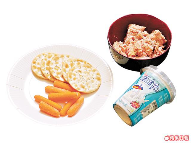 材料:餅乾、甘笋、水浸吞拿魚、藍莓、原味低脂乳酪各適量