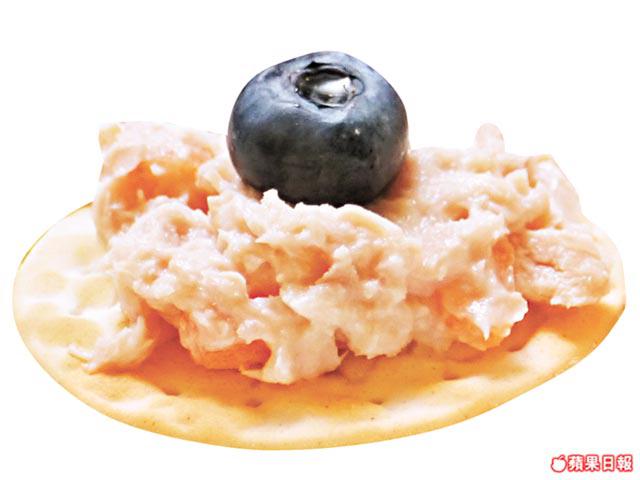 做法:吞拿魚壓碎,加入1湯匙乳酪拌勻。甘笋切粒與吞拿魚混合放餅乾上,再放藍莓。