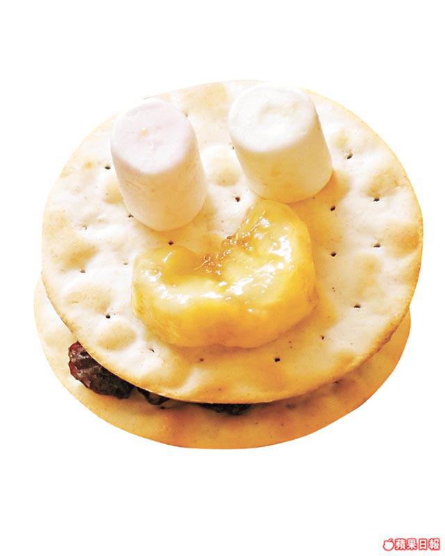 做法:大孖用餅乾夾香蕉、車厘茄、藍莓及棉花糖做成夾餅。