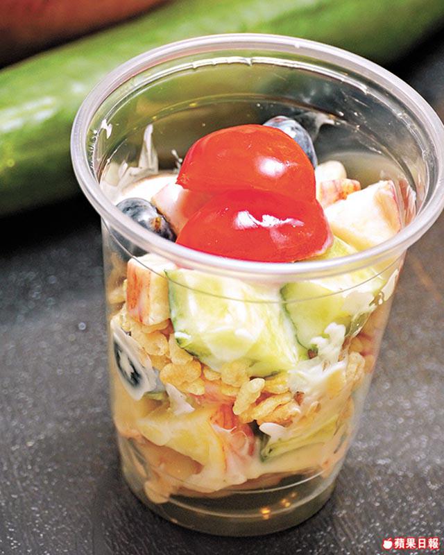 做法:蘋果及青瓜切粒,加入藍莓、車厘茄、粟米脆及1至2湯匙乳酪即成。