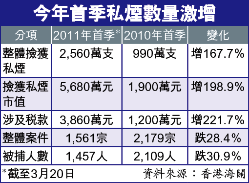 【本報訊】財政預算案勁加煙稅逾四成,每包香煙零售價增至50元,令大批不欲捱貴煙的煙民轉投私煙市場。海關指出,單是今年首季便撿獲2,560萬支私煙,較去年同期激增1.6倍,當中四成是冒牌煙,被捕人數也近1,500人,平均每日拘捕16人。消息人士指私煙銷售激增兩倍,反映越來越多煙民轉買私煙。