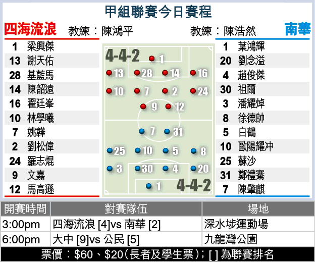 至於大打「風流波」的流浪,總監李輝立賽前表明先以1分為目標;中場姚韡更一語道破對手弱點︰「南華在聯賽不容再失分,面對的壓力比己隊更大;深水埗場較細,擅踢長傳的南華沒有任何着數。」