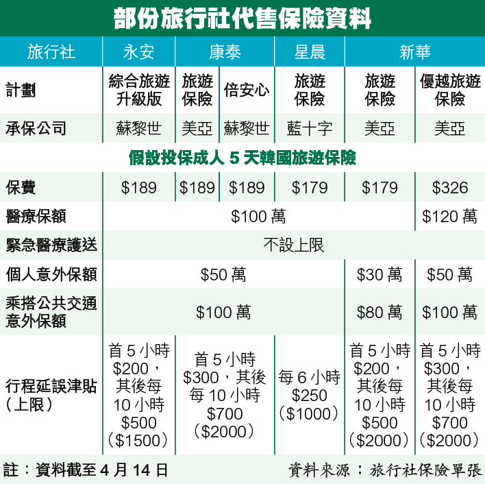 撇除新華的優越計劃,假設投保成人5天韓國旅遊保險,各家旅行的保費相若,為179元至189元。