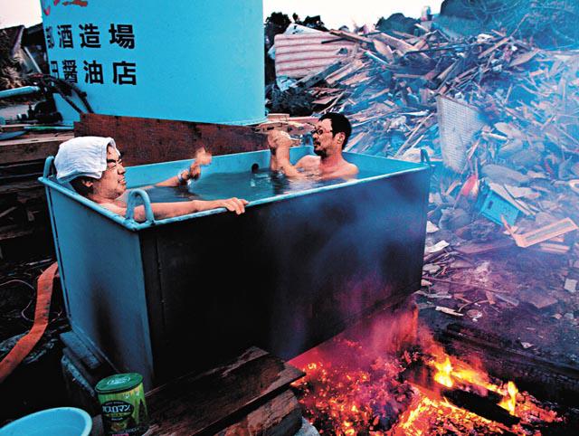 日本人一向愛泡澡,浸在熱氣騰騰的「湯」(熱水)中,一天疲勞盡消。在遭海嘯吞噬的宮城縣南三陸町,災民雖然痛失家園,但他們仍想盡辦法,找來完好的大缸,引來熱水,舒舒服服,泡個露天熱水浴,讓悲傷,隨熱氣,蒸發淨盡。