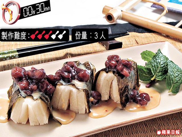 3.將年糕取出略拉長摺起,包上紫菜,淋上醬汁,加上紅豆茸即成。