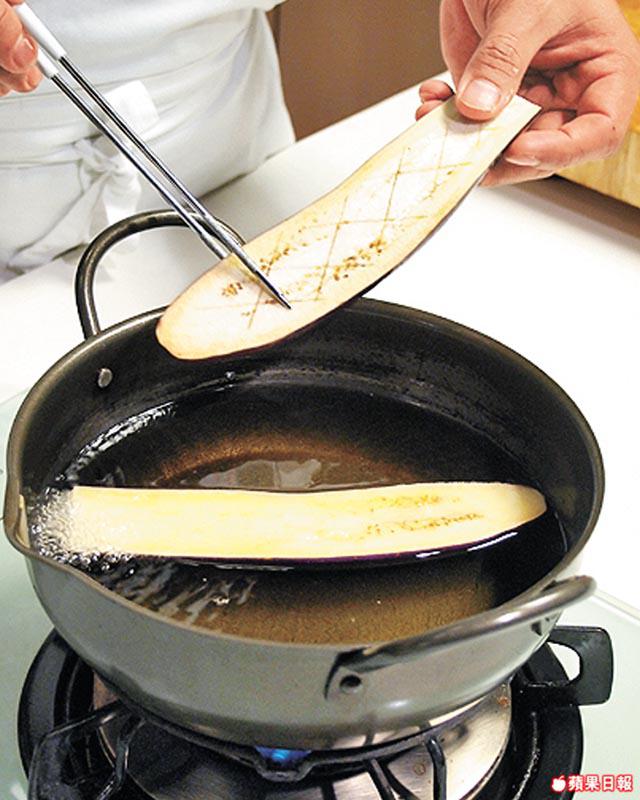 2.燒滾油至150℃,放入茄子,炸2分鐘反轉另一邊,再炸2分鐘,撈起瀝油。