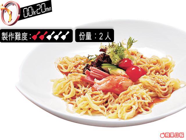 胡麻醬50克、蜜糖/炒芝麻各10克、車厘茄(開邊)5粒、火腿絲30克、蟹柳4條、沙律菜15克、青瓜20克、拉麪120克