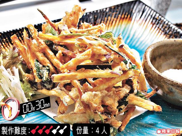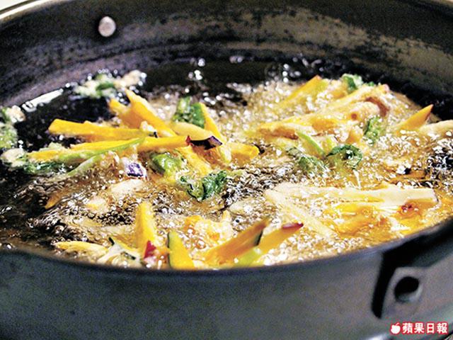 混合蔬菜時,粉不要下太多,否則炸出來的天婦羅便不夠香脆。