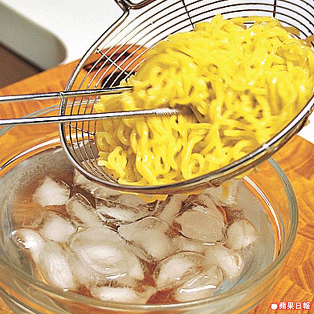 2.煲滾水,下拉麪以大火煮3分鐘,盛起浸冰水過冷河,盛起瀝水。