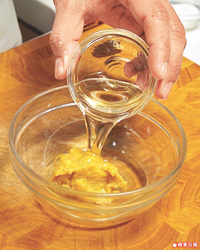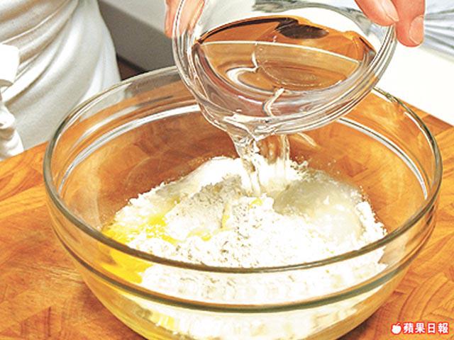 1.將195克的天婦羅粉加入蛋黃,逐少加入水拌勻。