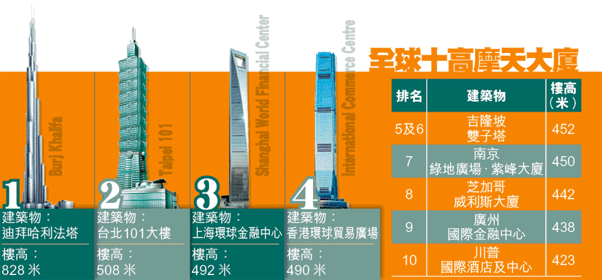 中國人向上望嘅鬥心,單睇兩岸三地嘅建築物就表露無遺,全球十高大廈,中港台三地佔一半席位。其中新地(016)喺西九嘅環球貿易廣場(ICC),樓高490米,躋身全球第四高。