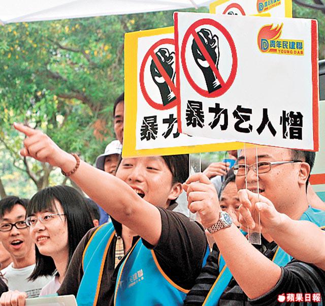 【本報訊】高官接二連三被示威人士「搶咪」,引發社會討論激烈抗爭是否可取,香港電台節目《城市論壇》昨天以此為題,台上與台下一樣熱鬧,青年民建聯成員更高舉「暴力乞人憎」的示威牌到場,聲討激烈抗爭行為,社民連主席陶君行嚴詞反駁抗爭絕非暴力,籲民建聯勿上綱上線,並諷刺左派六七暴動時隨街放炸彈才是暴力。