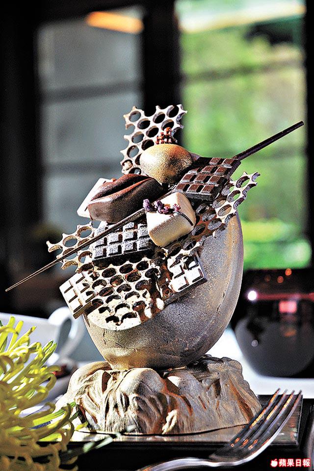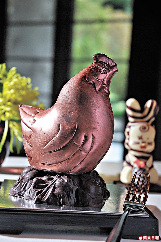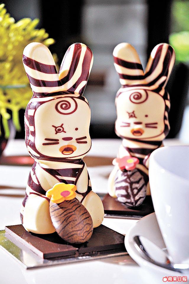 「COCO」法籍行政總餅廚Jean–MarcGaucher:「歐洲最普遍是雞造型的復活節朱古力,兔仔造型很少,香港人愛新奇,所以我創作這隻很有日本卡通感覺的魔法賓尼兔。」用35%象牙白朱古力做成的兔仔,上印橫紋很搶眼。另一主角母雞「喜迎新生」,則選用法國品牌Valrhone,用55%黑朱古力做大母雞,外噴食用金粉,感覺高貴。