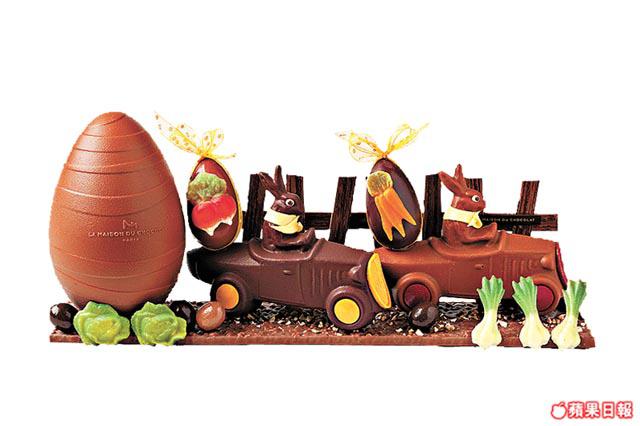 「LaMaisonduChocolat」創作出賽車兔Harold和Gaspard朱古力小型作品,地台兩邊飾以蔬菜和圍欄,賽車有牛奶和黑朱古力兩種味道選擇,車尾還擺放一隻貼上不同蔬果的朱古力蛋,非常可愛,用數種可可豆混製而成,味道濃郁,愛模型車的小孩子必定喜歡。小女孩愛靜,必喜歡綁上絲帶的朱古力兔子,肚內藏數粒朱古力蛋,很有心思。