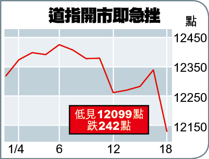 美股方面,道指昨早段最多挫242點或2%,低見12099;納斯達克綜合指數亦跌58點或2.1%,低見2706點。開市後個半小時,道指跌209點,報12132點,納指跌49點,至2715點。英、法及德國股市下跌2%至2.5%。