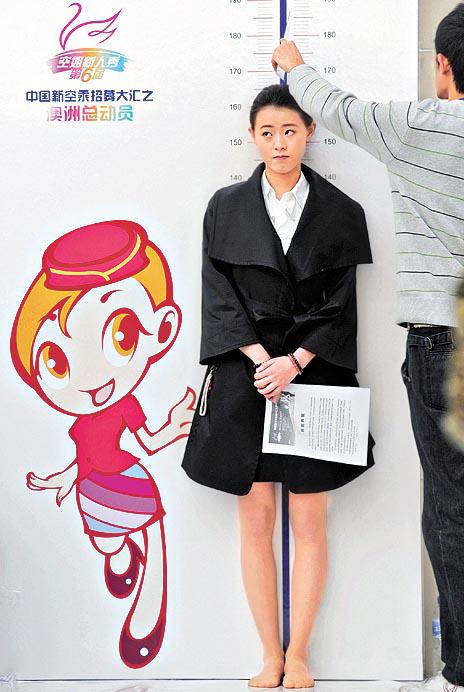 「讓我再測一次吧,行嗎!」南方航空近日在內地招聘1,500名空中服務員,當中選拔1,000名空姐時,體檢度高程序比選美更苛刻。工作人員為應徵者度高時,有專人在她腳跟下,放下一把尺,要是能把尺拉出,那證明踮腳,需重新量度。同時為防應徵者造假,度高時不但要除鞋,還要除掉絲襪(圖),以防襪子裏放鞋墊造假。其中一名湖南女子,穿着絲襪剛好到1.63米,合格,但脫掉絲襪再度,竟然差0.02厘米才合格,先後兩次重度結果一樣,最終被轟出局。