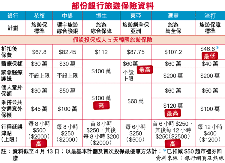 部份銀行趁復活節假期旅遊旺季,推出旅遊保險優惠,短線遊現時以韓國5天遊較多人選擇,若要為這旅程買保險,綜合6間銀行的保險,以渣打保費打折後約47元最低,但保障額不全面。