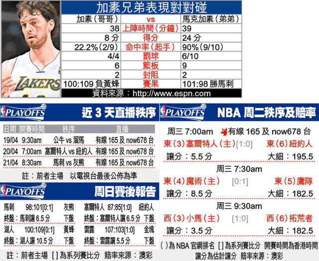 加素兄弟「天堂」與「地獄」!西岸8號種籽灰熊憑弟弟馬克加素攻入24分及9籃板,周日作客以101:98反勝西岸「1哥」馬刺,這亦是灰熊季後賽史上首場勝仗;相反哥哥加素全場僅入8分,湖人主場以100:109爆冷負黃蜂,更被傳媒狂插為輸波罪人!