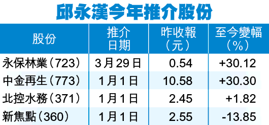 賺錢之神又認為,內地每年都面臨缺水問題,而將海水淡化成食水的政策或成中央解決問題的重要方法,因此他在今年初推薦北控水務(371)。北控水務年初至今先升後回,但邱永漢仍然深信該股有強勁增長潛力。
