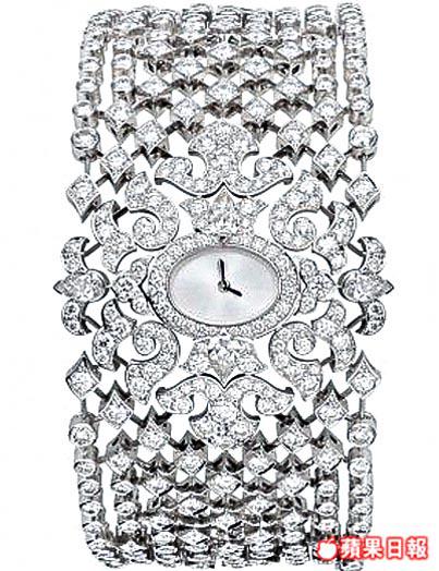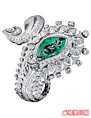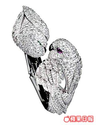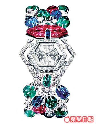 Hiddensecret也是這系列珠寶腕錶的特點,紅寶、藍寶、綠寶鑲成的fruity寶石手鐲,中央揭起一片雕刻的紅寶,便見到hiddenwatch;雙鸚鵡鑽石錶,妙趣的時計隱藏在其中一隻鳥的翅膀內,完全私有的美麗趣味。