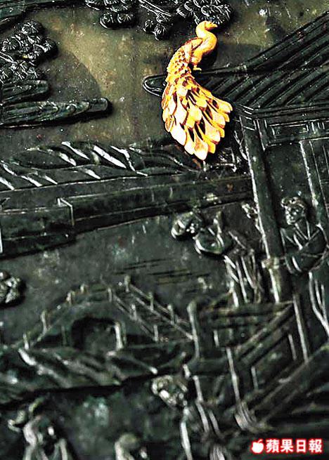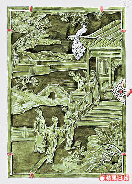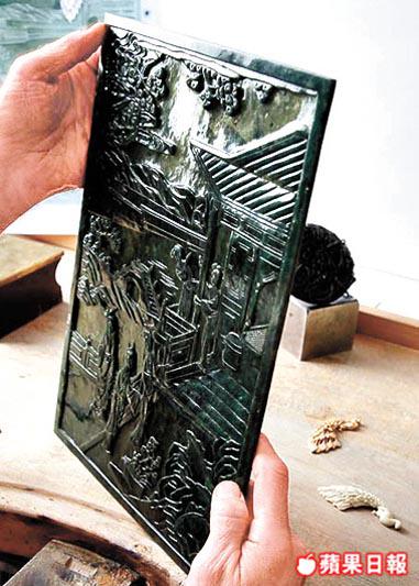 當中充滿東方色彩的精品,要數一個玉石雕刻珠寶盒,設計工藝師從一片古董的長方人物玉雕件作基礎,伴名貴實木改裝成盒子,玉雕面再鑲上細膩的鑽石孔雀,放在雕件的簷角上,將新元素融入古董中,穿越古今的新舊思維。